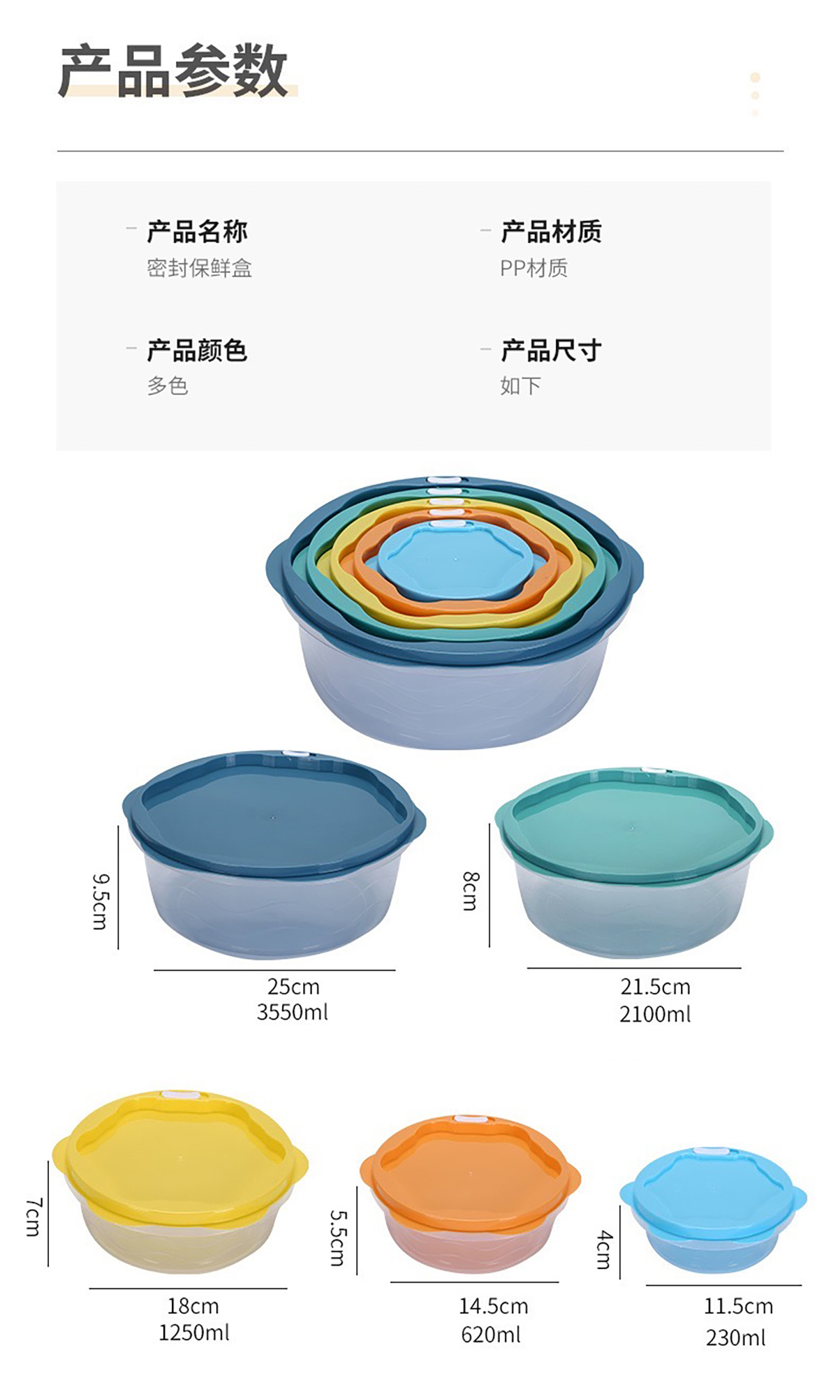 Size: 115*40mm/230ml 145*55mm/620ml 180*70mm/1250ml 215*80mm/2100ml 250*95mm/3550ml
